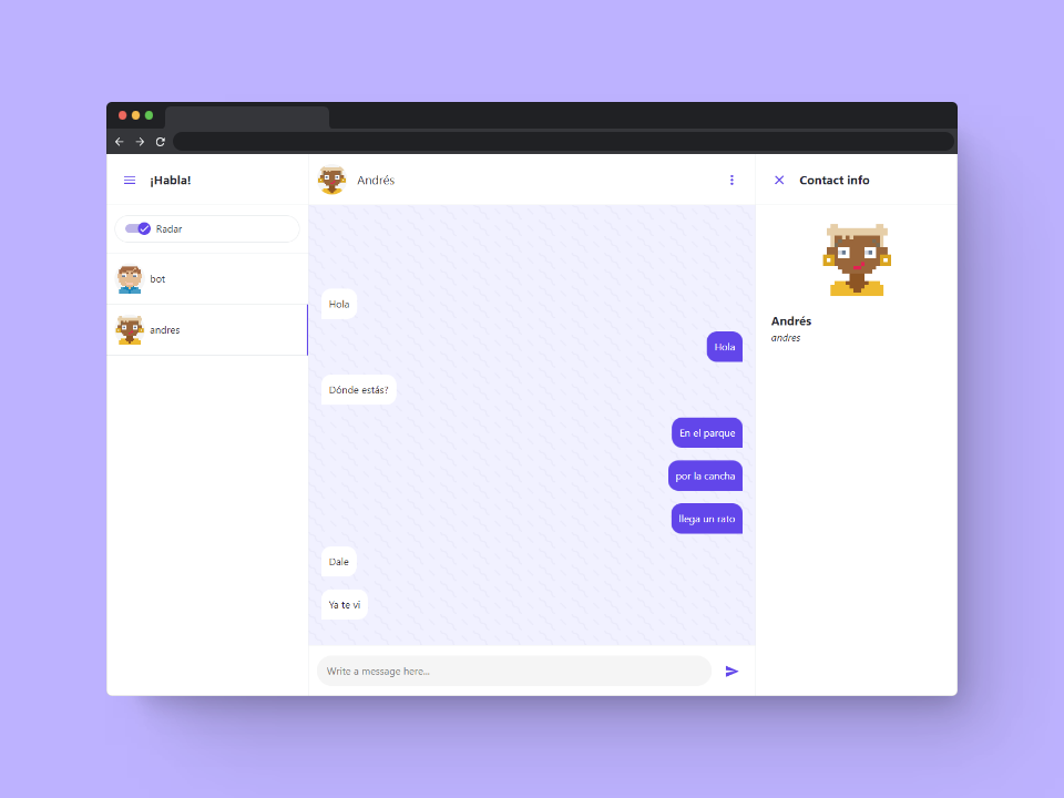 ¡Habla! es una app de chat que desarrollé como proyecto personal para aprender un poco más sobre websockets y porque nunca había hecho una aplicación de chat y ya tocaba.